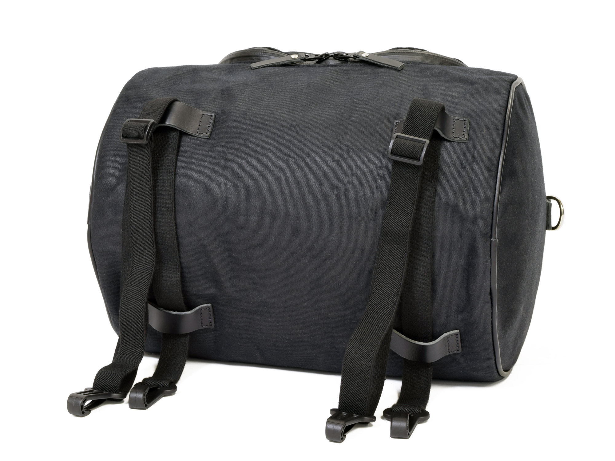 ・ ツーリングに活躍するダッフルバッグは、ピリオンシートやリアラックに載せるオートバイ専用にデザインされています。上下左右6箇所にベルトループを備えており、付属のフック付きエラスティックコード(伸縮ベルト)を通して、荷物の量に応じて簡単に固定できます。