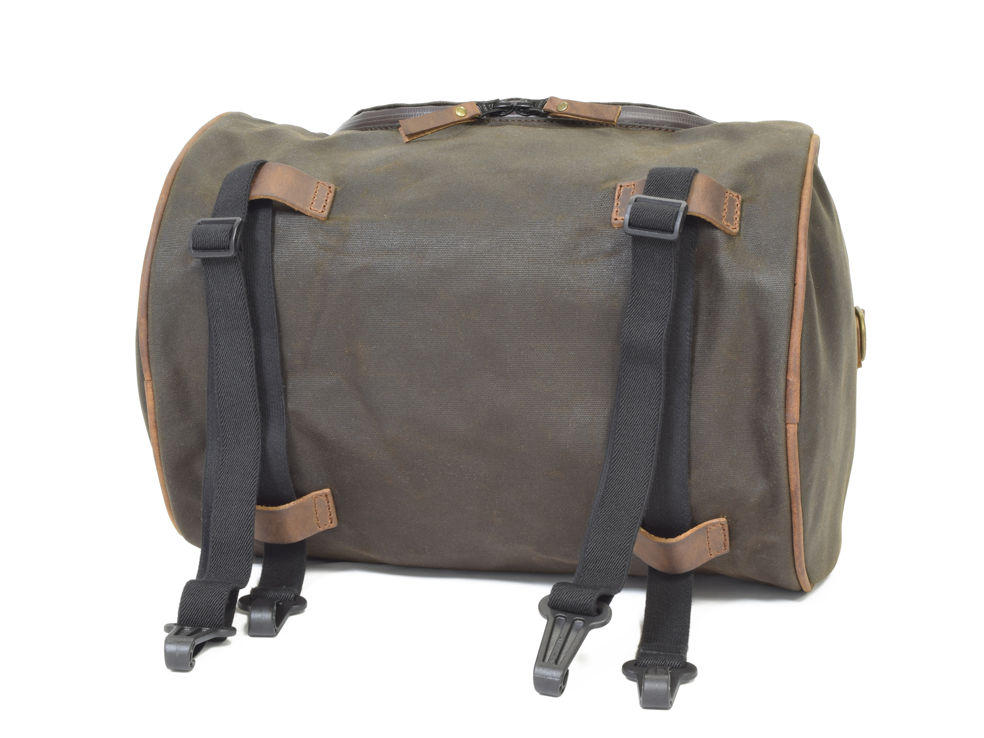 ・ ツーリングに活躍するダッフルバッグは、ピリオンシートやリアラックに載せるオートバイ専用にデザインされています。上下左右6箇所にベルトループを備えており、付属のフック付きエラスティックコード(伸縮ベルト)を通して、荷物の量に応じて簡単に固定できます。