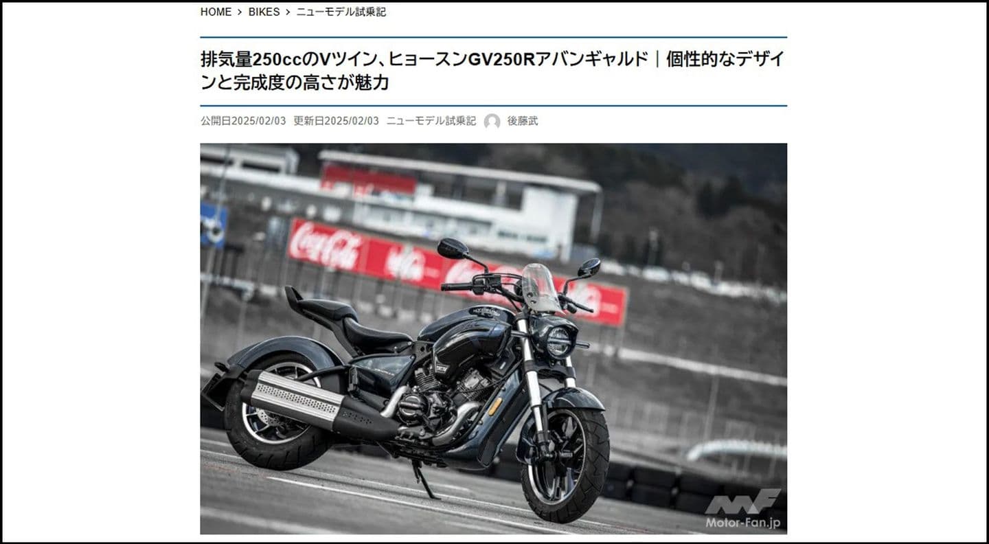 アジアンバイクを紹介する連載コーナーで、『GV250R アバンギャルド』の試乗インプレが掲載されています。