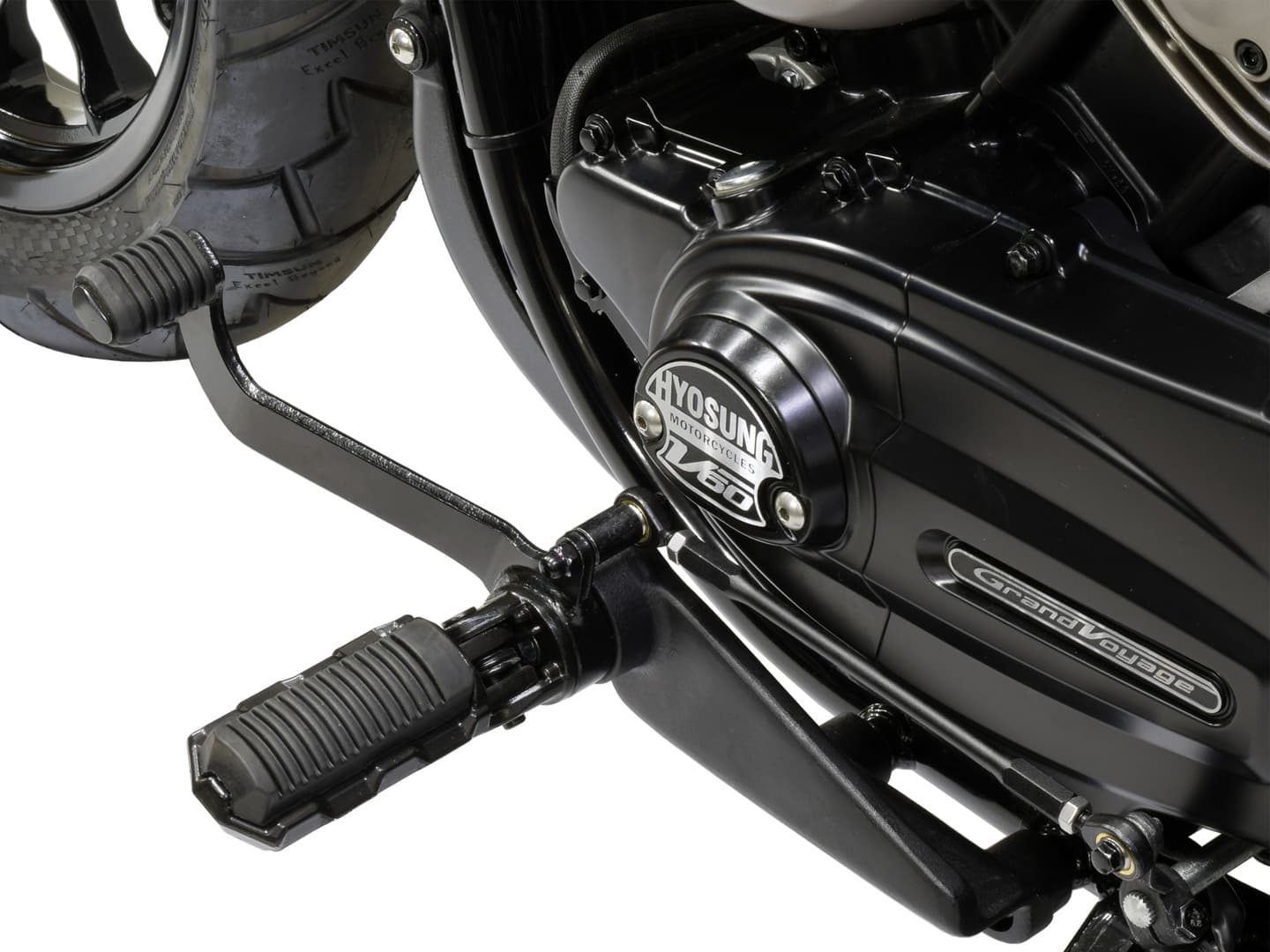アップライトなハンドルバー形状に合わせて、フロント(ライダー)のフットレストはやや前方にセットされたミッドコントロール。