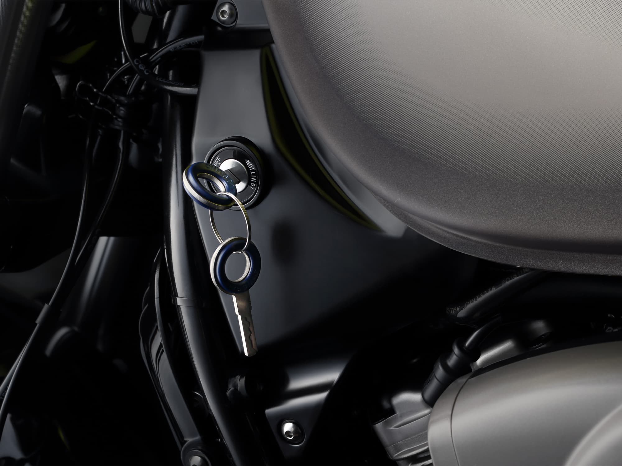 イグニッションキーは、メーター周りの視界の妨げにならないように、ステアリングステムの左サイドに配置されています。