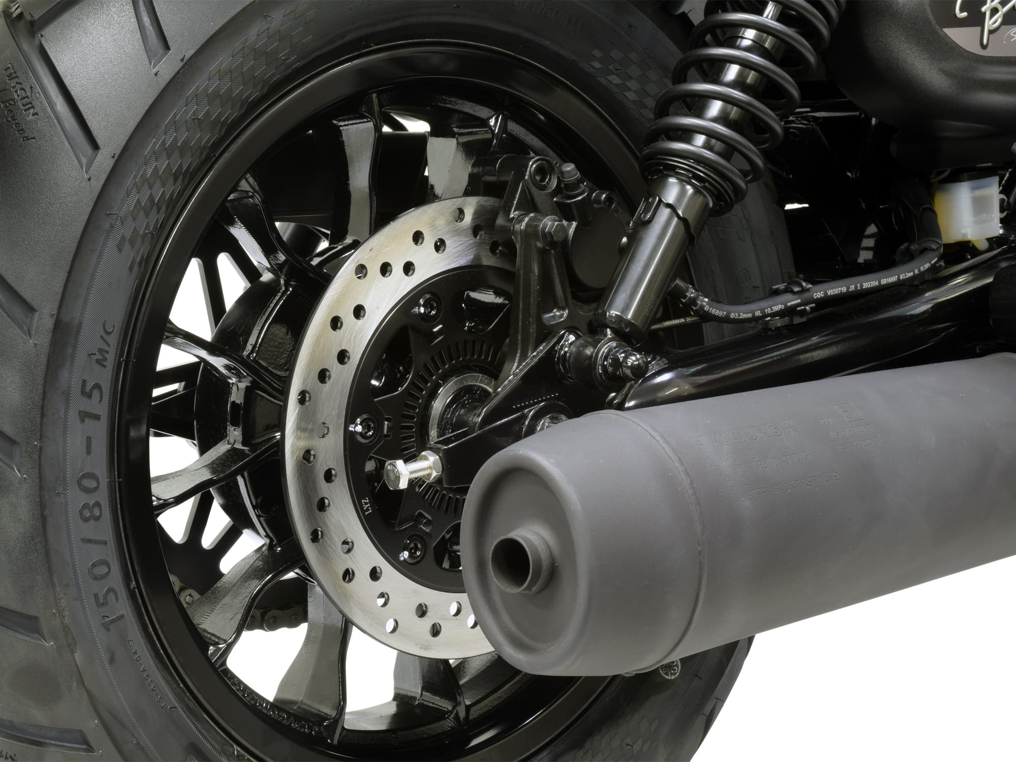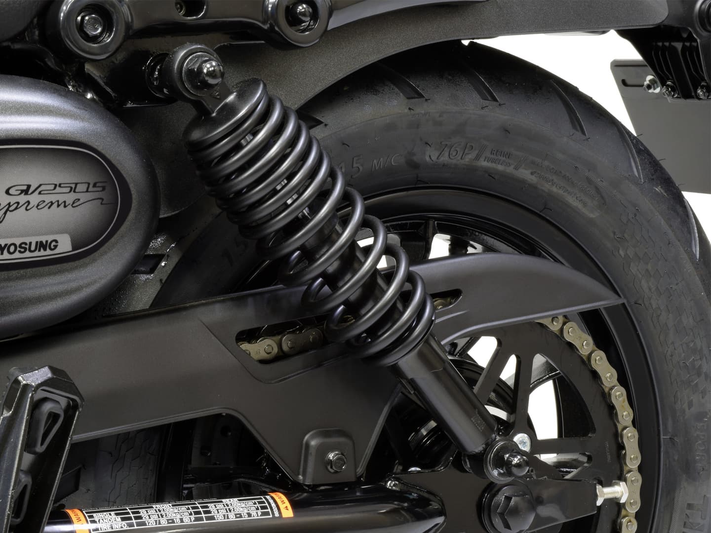 リアサスペンションは、信頼性の高いコンベンショナルなツインショックを装備。フロント倒立フォークとの組合せで、安定した直進性と、低重心を活かしたリニアなハンドリングを実現しています。
