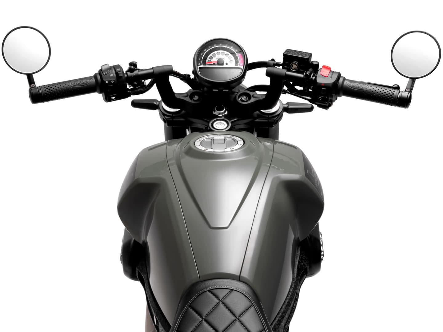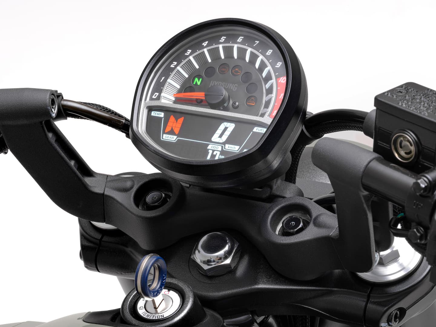 イグニッションキーは、ステアリングの妨げにならないように、フューエルタンクの前端に装備されています。