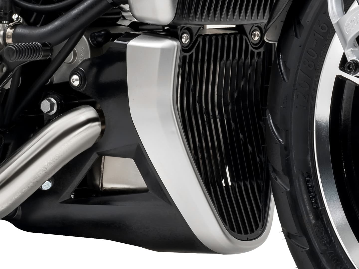 大容量のエキゾーストチャンバーは、エンジン前方に配置することで、車体下部の最低地上高を確保し、また、ラジエターと統一感のあるカバーによって空力特性にも配慮しています。