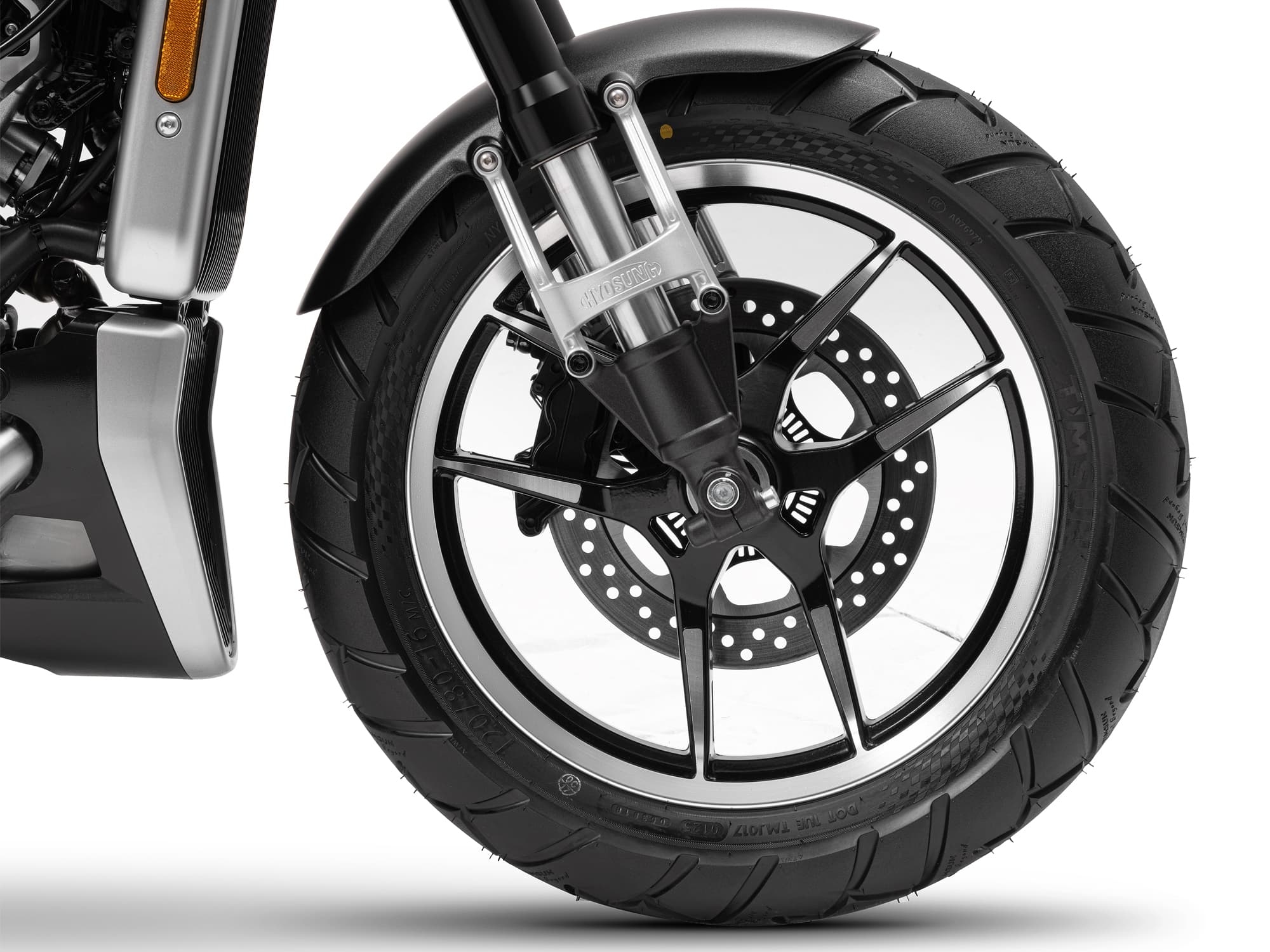 高級感が漂う切削加工がされたキャストホイールは、フロント16インチ、リア15インチの組合せ。