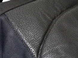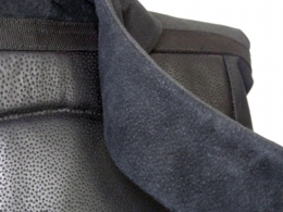 快適さを左右する背面パッドの素材にもこだわっています。背中と接する面には、軽く柔らかで通気性も良いピッグスプリットレザーを使用。特殊なアイロン仕上げにより表面はしなやかな手触りで、摩擦に強い耐久性も特長です。