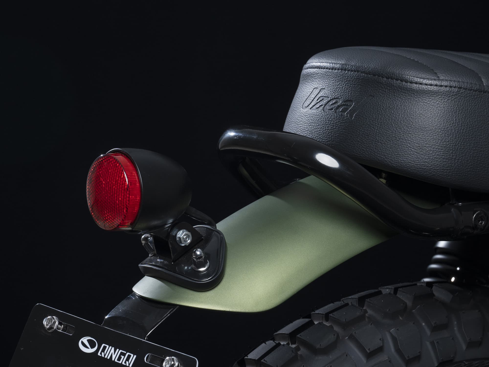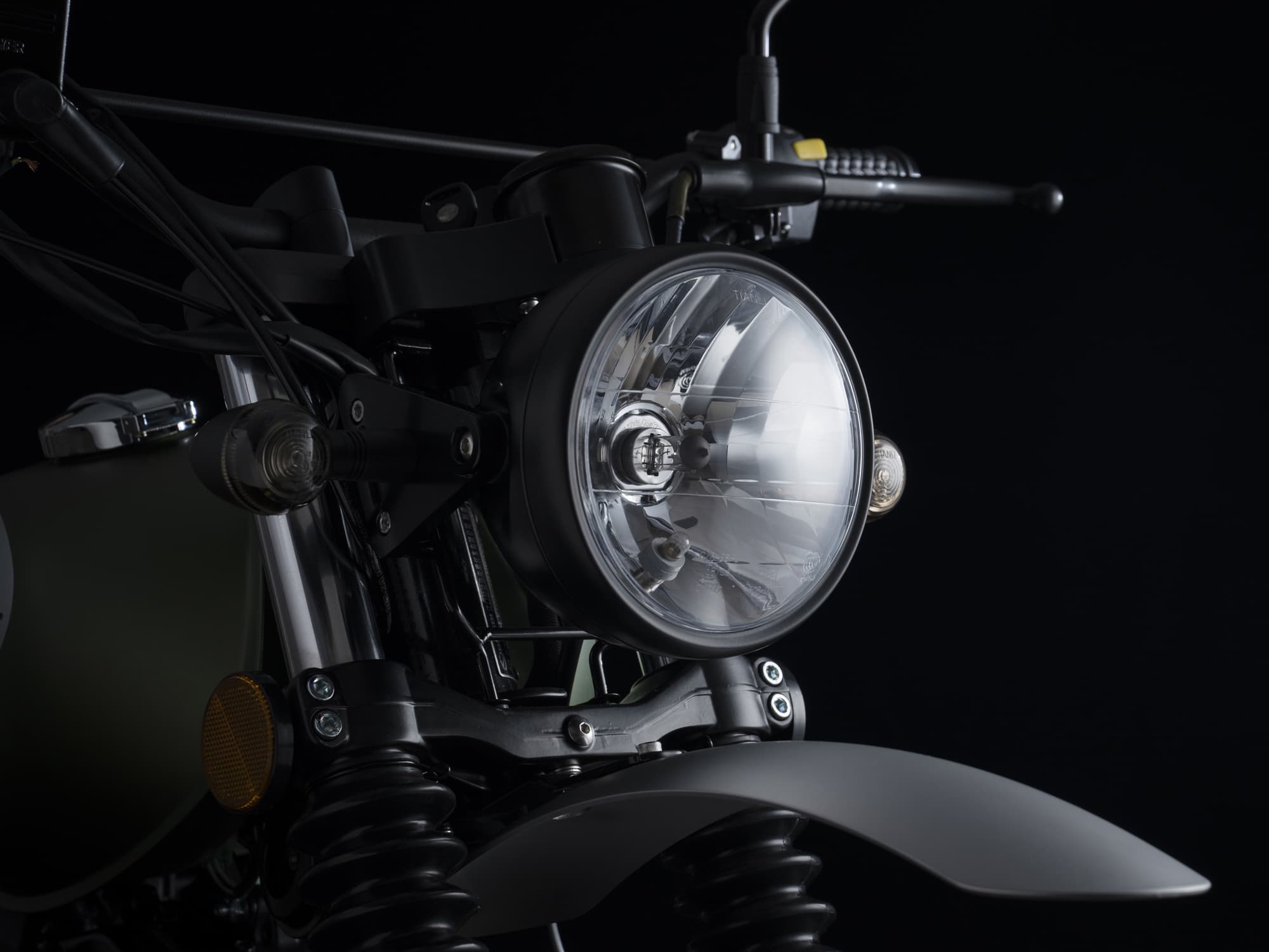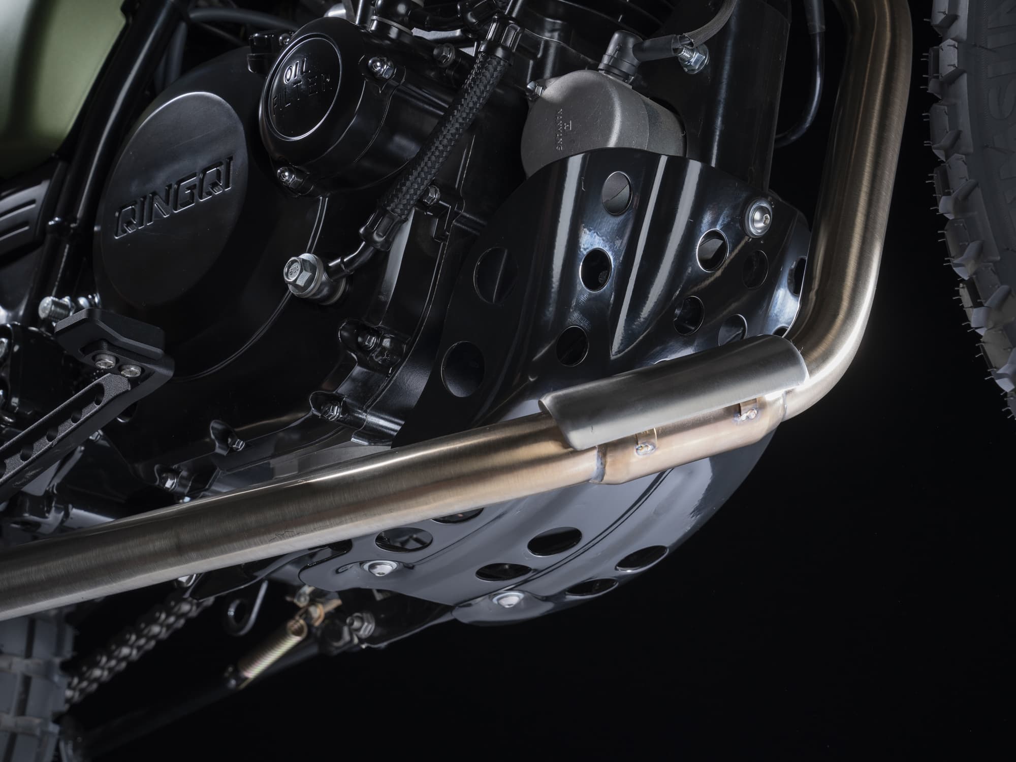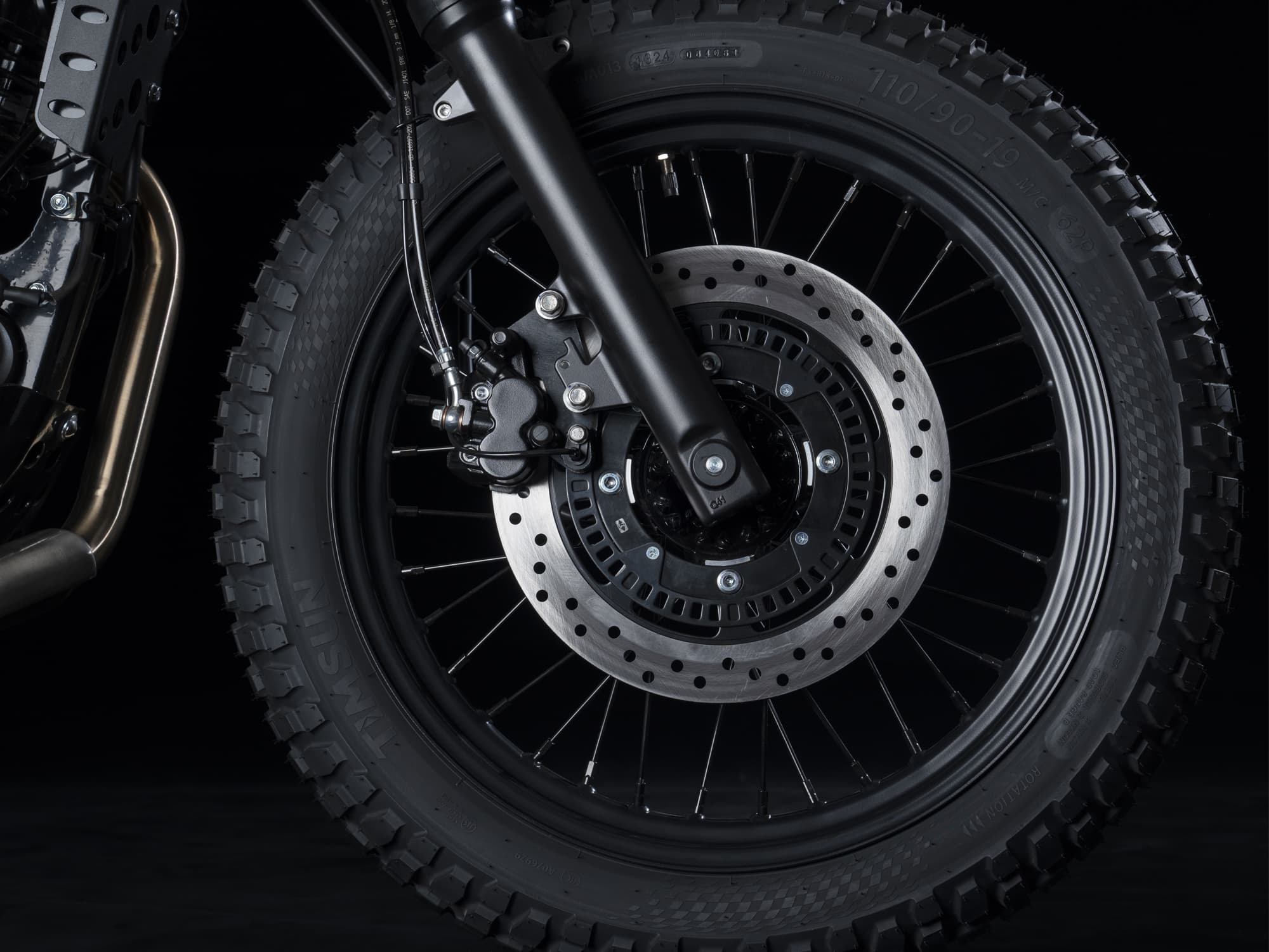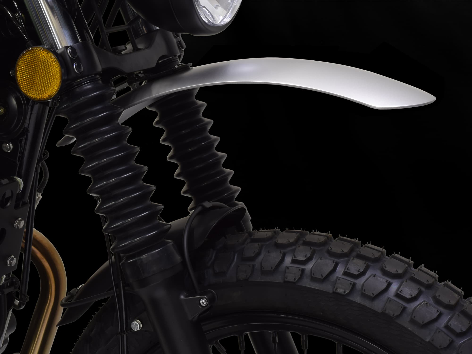 アップフェンダーと大径ホイール、プロテクター類を装備したスクランブラースタイル。
